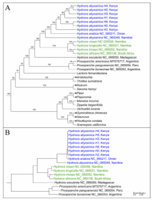 研究报道了肯尼亚东非鞭寄生的第一个质体基因组,其具有典型的四分体结构,编码24个独特的基因。根据系统发育树的结果,来自肯尼亚的东非鞭寄生为单系群,且与纳米比亚的东非鞭寄生和来自阿曼的阿拉伯鞭寄生一起形成一个分支。然而,东非鞭寄生作为一个整体与阿拉伯鞭寄生嵌套,为并系群。这一结果得到了不同结构的质体基因组共同验证以及遗传距离估计的支持,揭示了非洲鞭寄生属物种中潜在的多样性。