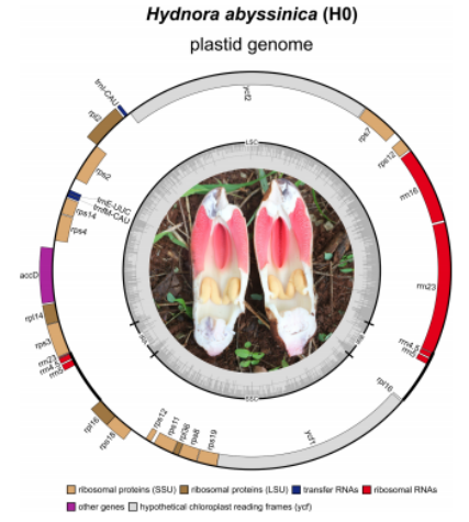 近日,中国科学院武汉植物园东非植物区系与分类学科组的科研人员经过全面的资料查询和数据整理,利用质体基因组测序、组装、注释和构建分子系统发育树等手段,对鞭寄生科(Hydnoraceae)鞭寄生属(Hydnora)植物开展了系统发育研究。相关成果以“Phylogenetic and comparative analyses of Hydnora abyssinica plastomes provide evidence for hidden diversity within Hydnoraceae”为题,发表在SCI期刊《BMC Ecology and Evolution》上。