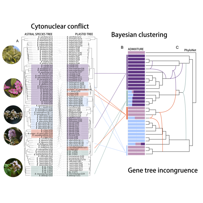 近日,中国科学院昆明植物研究所科研人员与华盛顿大学Richard Olmstead展开合作,对亚洲醉鱼草属植物进行了全面的取样和物种倍性信息测定,同时利用浅层测序数据,对亚洲醉鱼草属植物每个样品进行了叶绿体全基因组组装、nrDNA序列构建、低拷贝核基因构建以及单核苷酸多态性(SNP)的挖掘。本研究通过核质冲突、基因树不一致、贝叶斯聚类等分析方法结合物种倍性信息,推测了亚洲醉鱼草属植物复杂的的网状演化历史(图二)。同时利用大量低拷贝核基因(low-copy nuclear gene)为亚洲醉鱼草属植物推断出一个稳健的物种树,从而厘清了该分支属下分类关系,纠正了一些早期的物种界定错误,并发现了多个被错误归并的隐存种。叶绿体分化时间表明,亚洲醉鱼草的多样化发生于8–10Ma和0–3Ma,分别对应了横断山脉的最后一次隆升和第四纪气候震荡。综上,本研究揭示多倍化和广泛的杂交现象加之地质运动和气候变化共同促进了亚洲醉鱼草的物种形成。
