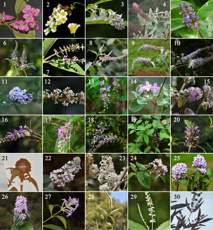 图二 亚洲醉鱼草属植物:1. 大花醉鱼草Buddleja colvilei;2. 无柄醉鱼草B. sessilifolia;3. 滇川醉鱼草B. forrestii;4. 大序醉鱼草B. macrostachya;5. 金沙江醉鱼草B. nivea;6. 酒药花醉鱼草B. myriantha;7. 密香醉鱼草B. candida;8. 巴东醉鱼草B. albiflora; 9. 紫花醉鱼草 B. fallowiana;10. 大叶醉鱼草B. davidii;11. 互叶醉鱼草B. alternifolia;12. 泽当醉鱼草 B. tsetangensis;13. 金丝峡醉鱼草B. jinsixiaensis;14. 莸叶醉鱼草B. caryopteridifolia;15. 皱叶醉鱼草B. crispa;16. 台湾醉鱼草B. curviflora;17. 日本醉鱼草B. japonica;18. 醉鱼草B. lindleyana;19. 醉鱼草B. lindleyana (GJ68);20. 云南醉鱼草B. yunnanensis;21. 亚头状醉鱼草B. subcapitata;22. 密蒙花B. officinalis;23. 喉药醉鱼草B. paniculata;24. 腺叶醉鱼草B. delavayi;25. 小序醉鱼草B. microstachya;26. B. sp. 1;27. 短序醉鱼草B. brachystachya;28. 白背枫B. asiatica;29. 白背枫(异名:亚齿状醉鱼草)B. asiatica = B. subserrata;30. 不丹醉鱼草B. bhutanica。