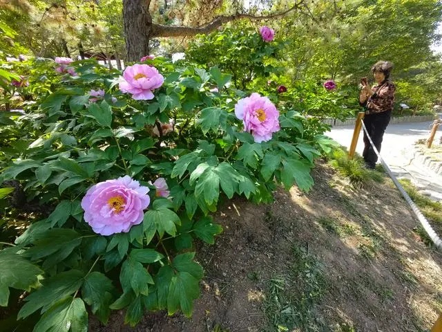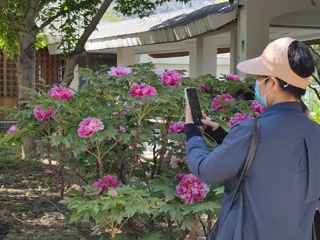 f花可观赏、根可医病、籽油可食用,牡丹在我国已经有2000余年的应用历史,是我国特有的资源植物,被誉为“花中之王”。盛放的牡丹花丛旁有一处科普展示中心,详细讲述了牡丹的故事。历经3代科研工作者的努力,国家植物园(南园)保存、繁育了世界三分之二以上的牡丹种质资源,并自主培育了一批牡丹新品种。